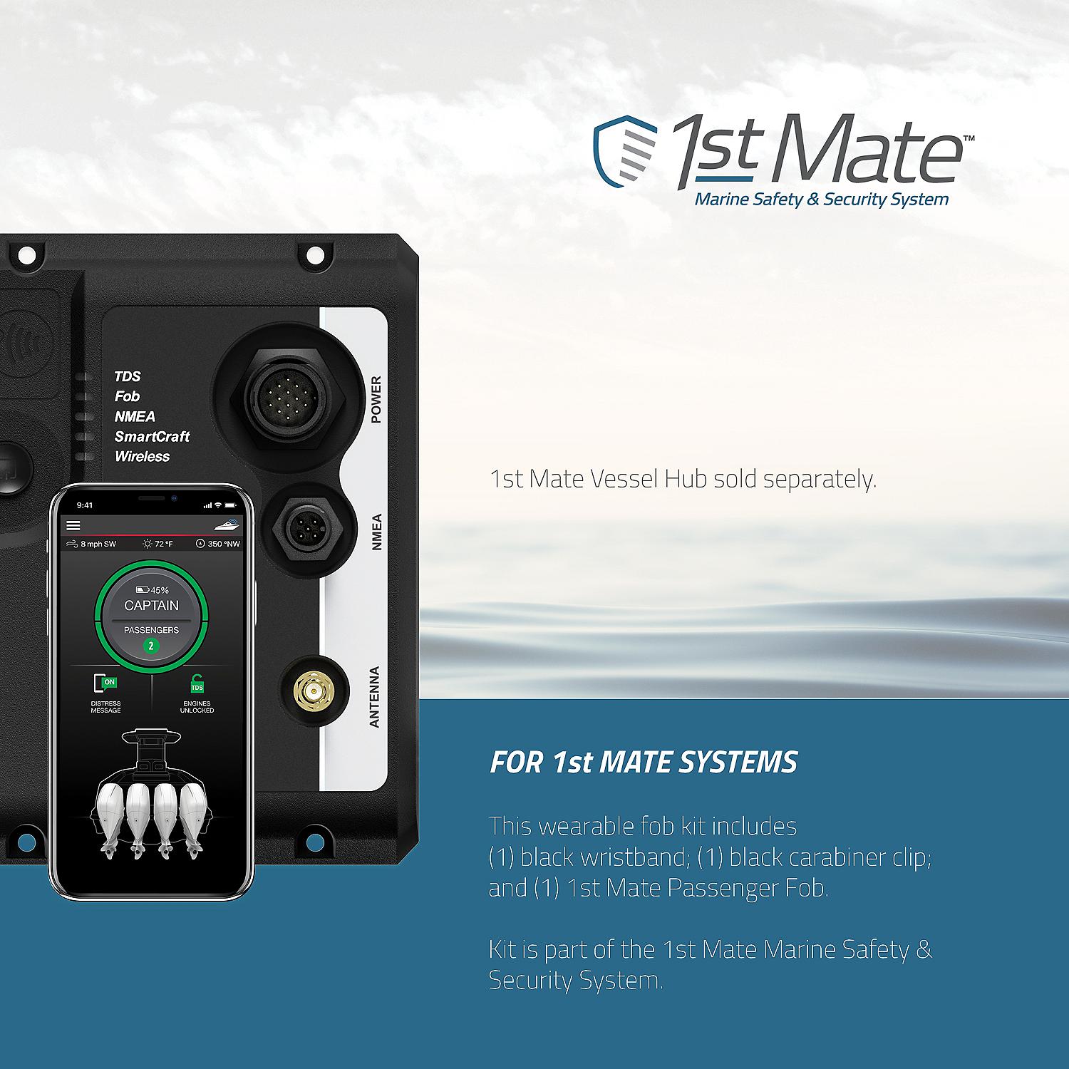 The 1st Mate system is the industry's first engine-integrated intelligent hub and wearable device that integrates with marine propulsion systems to provide safety alerts and information. The main features of 1st Mate include man overboard monitoring for captain and up to 7 passengers, distress message capability, and theft deterrent functionality. This wearable passenger's fob kit is specifically made for 1st Mate's Mercury SmartCraft engines, and includes the passenger fob, an adjustable wristband and carabiner clip. The new standard in marine safety and security, 1st Mate adds another layer of boating safety by notifying a boat's captain or its passengers if someone has fallen overboard. 1st Mate also serves as an effective deterrent to boat-and-engine theft.