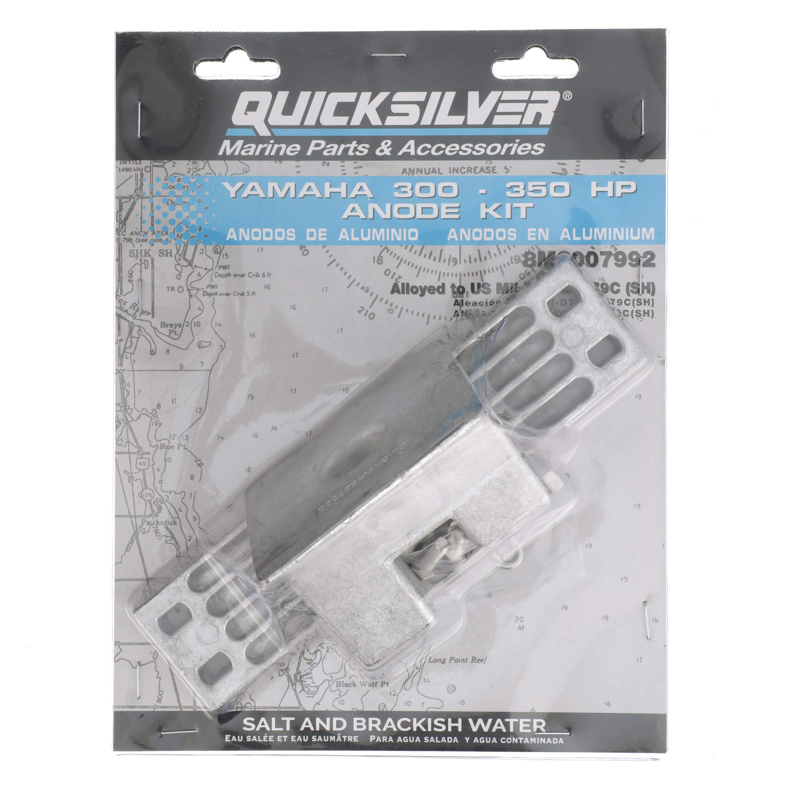 Complete, replacement aluminum anode kit 8M6007992 fits 300-350hp Yamaha outboards. Stainless steel hardware and installation hardware provided with easy instructions. Aluminum is 50% lighter and lasts up to 50% longer than zinc in harsh, saltwater environments and is more efficient in protecting the outboard, drive and boat from galvanic corrosion. Protect your outboard from the harmful effects of galvanic corrosion. Inspect annually and easy to replace. Periodic maintenance and service helps protect your investment in your engine and your boating pleasure. See your owner's manual or service manual for specific application and instructions. The Quicksilver brand is the leader in delivering uncompromising engine oils, parts and accessories to the marine industry for over 65 years. Quicksilver is the premier supplier of Mercury Marine original equipment replacement engine parts, oils, and accessories, but also works to serve all original equipment brands in the marine and powersports industries. It has earned a loyal following by providing the highest quality products that are tested through some of the most rigorous environments and testing procedures. No aftermarket company comes close to the level of research and design as Quicksilver; buying Quicksilver is buying performance, protection and peace of mind.