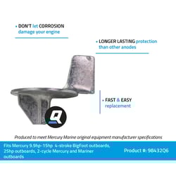 The Quicksilver 98432Q6 is an extended zinc trim tab anode plate designed to provide critical corrosion protection for Mercury and Mariner outboard motors. This sacrificial anode fits directly into the anti-ventilation plate trim tab anode cavity, protecting vital engine components from galvanic corrosion in both freshwater and saltwater environments.