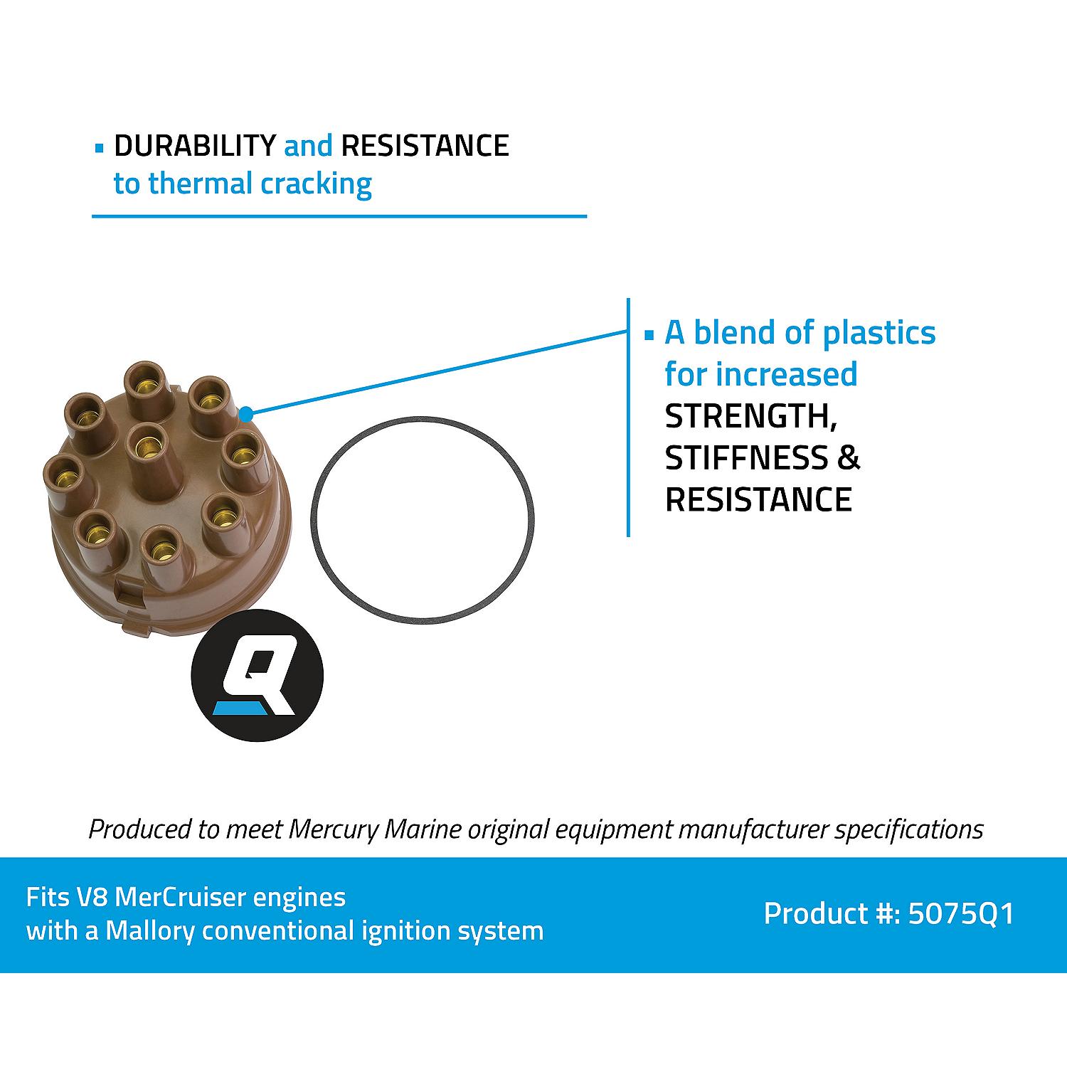 The Quicksilver 5075Q1 distributor cap is a genuine Mercury Marine OEM replacement part designed specifically for marinized V8 MerCruiser engines manufactured by Ford Motor Company equipped with Mallory conventional ignition systems. This precision-engineered component ensures reliable spark distribution and optimal engine performance in demanding marine environments.