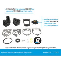 The Quicksilver 77177A3 water pump repair kit provides comprehensive service parts for Mercury and Mariner 2-cycle outboard engines from 30 to 70 horsepower. This complete kit ensures reliable cooling system performance and extends engine life by delivering all essential components in one package.