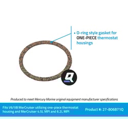 Thermostat o-ring style rubber gasket 806871Q is for V6 and V8 MerCruiser Sterndrive and Inboard engines made by General Motors using the newer style, 1-piece thermostat housing. It can also be used on MerCruiser 4.5L MPI (multi-port injection) and 6.2L MPI engines (serial No. 2A456613 and up). The Quicksilver brand is the leader in delivering uncompromising engine oils, parts and accessories to the marine industry for over 65 years. Quicksilver is the premier supplier of Mercury Marine original equipment replacement engine parts, oils, and accessories, but also works to serve all original equipment brands in the marine and powersports industries. It has earned a loyal following by providing the highest quality products that are tested through some of the most rigorous environments and testing procedures. No aftermarket company comes close to the level of research and design as Quicksilver; buying Quicksilver is buying performance, protection and peace of mind.