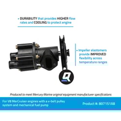 The Quicksilver 807151A8 is a replacement sea water pump housing designed specifically for V8 MerCruiser sterndrive engines manufactured by General Motors. This housing is engineered to fit 454 and 502 cubic inch displacement engines (Gen V and Gen VI) equipped with a V-belt pulley system for engine accessories and mechanical fuel pumps.