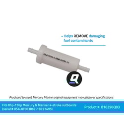 The Quicksilver 816296Q03 is a genuine OEM replacement inline fuel filter element designed specifically for 8-15hp Mercury and Mariner 4-stroke outboards (serial number range USA-0T003862 through 1B727495). This essential maintenance component protects your engine by filtering out water, moisture, dirt, and other fuel-borne contaminants before they can damage internal components or rob your engine of performance.