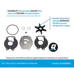 The Quicksilver 85089Q4 Water Pump Repair Kit is designed specifically for 15-25HP 2-stroke Mercury and Mariner outboard engines. This complete 8-piece repair kit provides everything needed to restore proper cooling system performance and protect your engine from overheating damage.