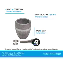 The Quicksilver 865182Q01 aluminum anode kit provides essential corrosion protection for MerCruiser Bravo III sterndrive units with serial numbers 0M179452 and up. This complete kit includes a cast aluminum anode, stainless steel hex bolt, and washers for secure attachment to the prop shaft.