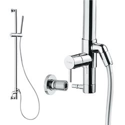 This unique sliding rail shower system combines a 28-inch-long shower rail with an integrated mixer, hose, and shower handle all in one. Installation requires the hot and cold water supplies to be connected to the top and bottom mounting system of the rail.