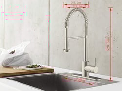 The Empire Brass SP5000N-A RV Kitchen Faucet features a sleek hi-arc coiled hammer-style retractable pull-down head with stream and spray options. Constructed with stainless steel and finished in an attractive brushed nickel, this professional-grade faucet is designed specifically for RV and mobile home applications.