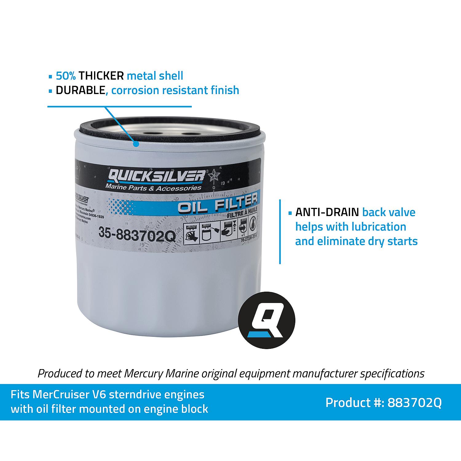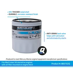 The Quicksilver 883702Q is a premium replacement oil filter engineered specifically for V6 MerCruiser sterndrive engines with block-mounted oil filter systems. This OEM-quality filter is not compatible with remote oil filter configurations.