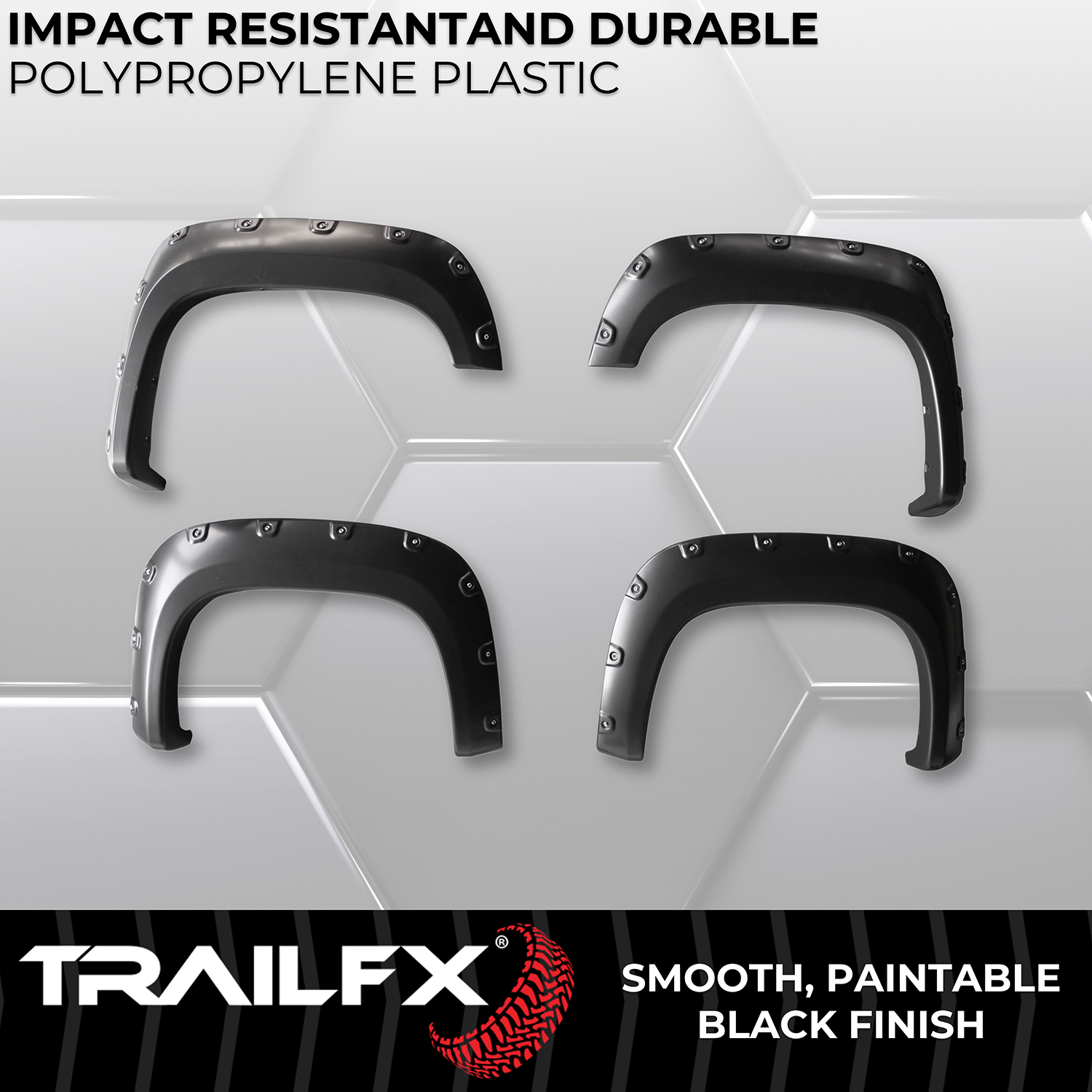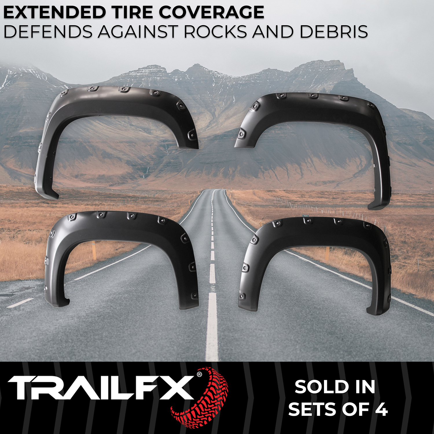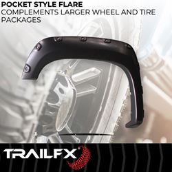 The TrailFX TFG3001S Pocket Style Fender Flares deliver aggressive styling and enhanced tire coverage with a smooth, paintable finish. This complete set of four flares features the distinctive pocket rivet design that adds a rugged, off-road appearance to your truck while protecting the body from road debris and allowing for larger tire fitments.