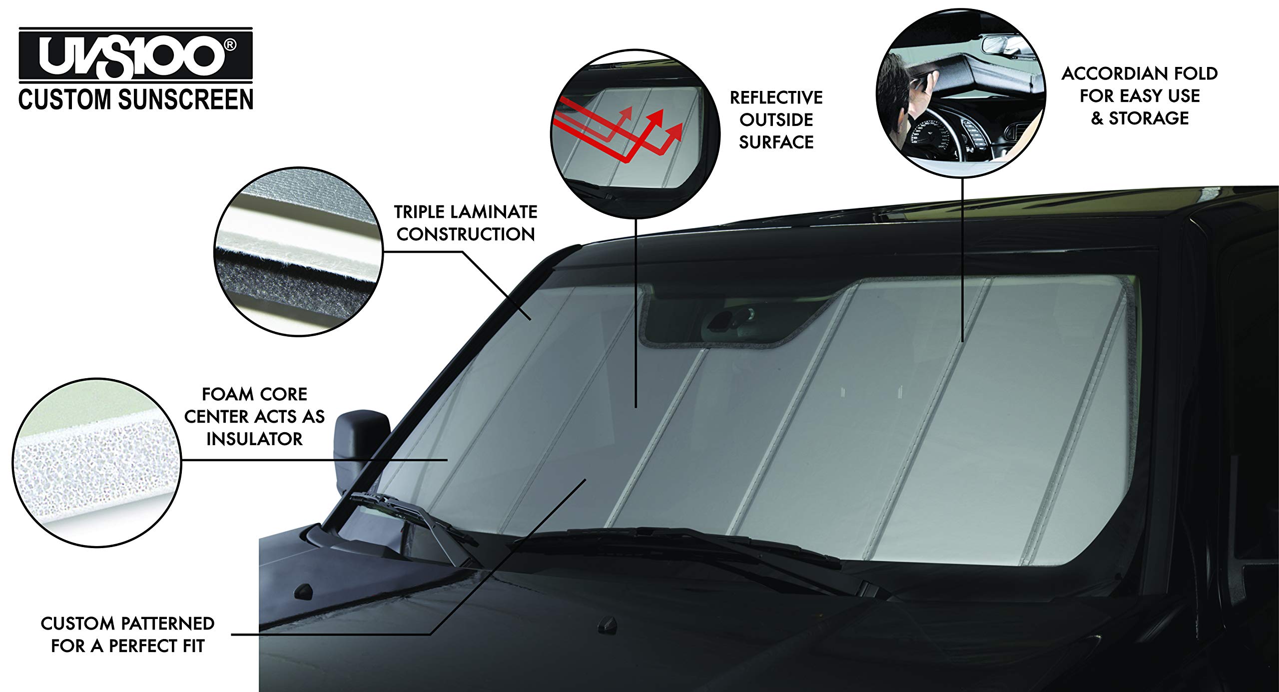 The UVS100 series features Covercraft's proven triple-layer laminate technology that blocks harmful UV rays while keeping your vehicle's interior significantly cooler than unprotected vehicles. The accordion-fold design allows the sunscreen to collapse into a compact size for convenient storage when not in use, and the custom pattern ensures a perfect fit without gaps or overlap.