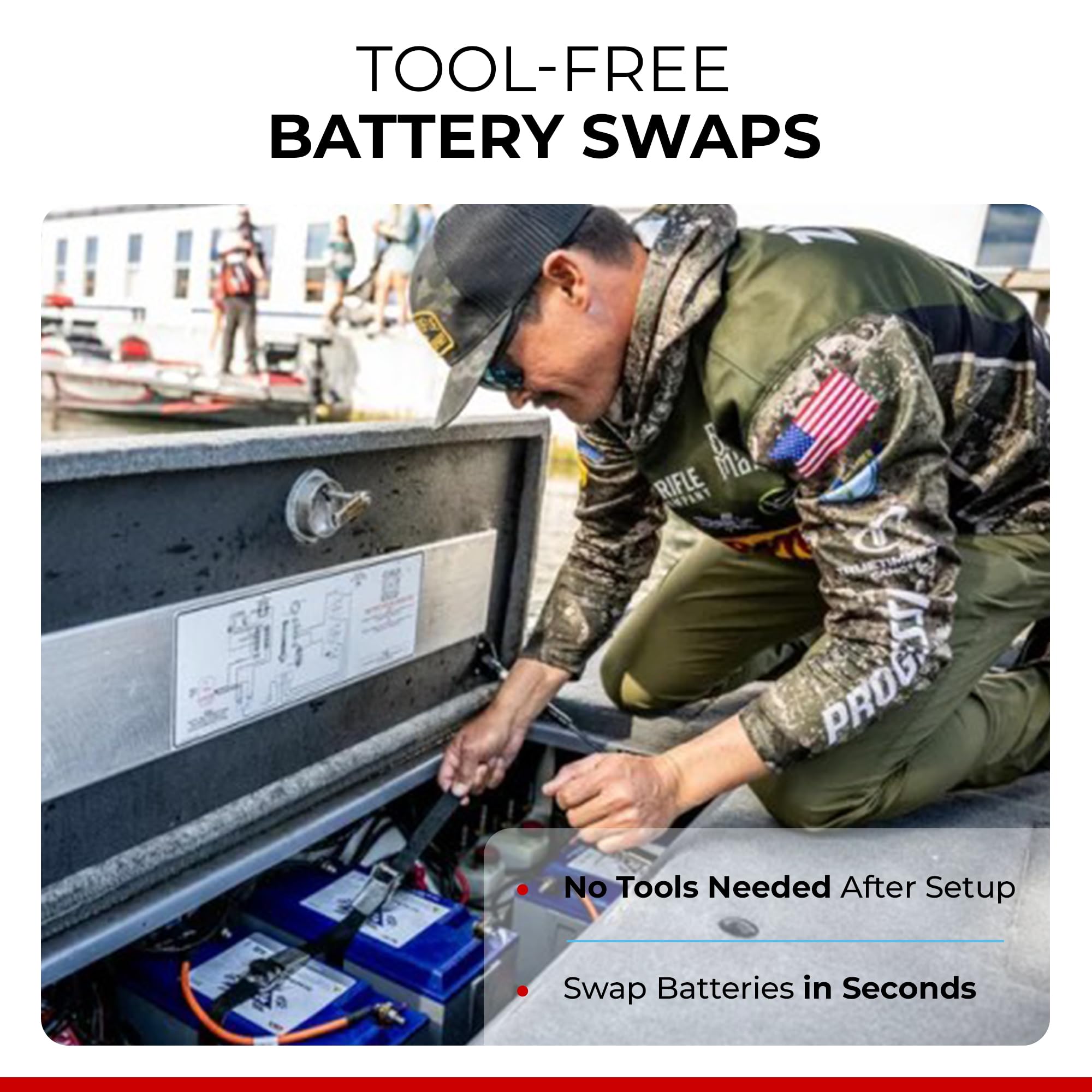 • Keeps trolling motor connections intact whether batteries are installed or removed from the boat