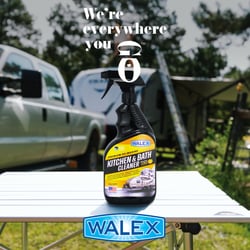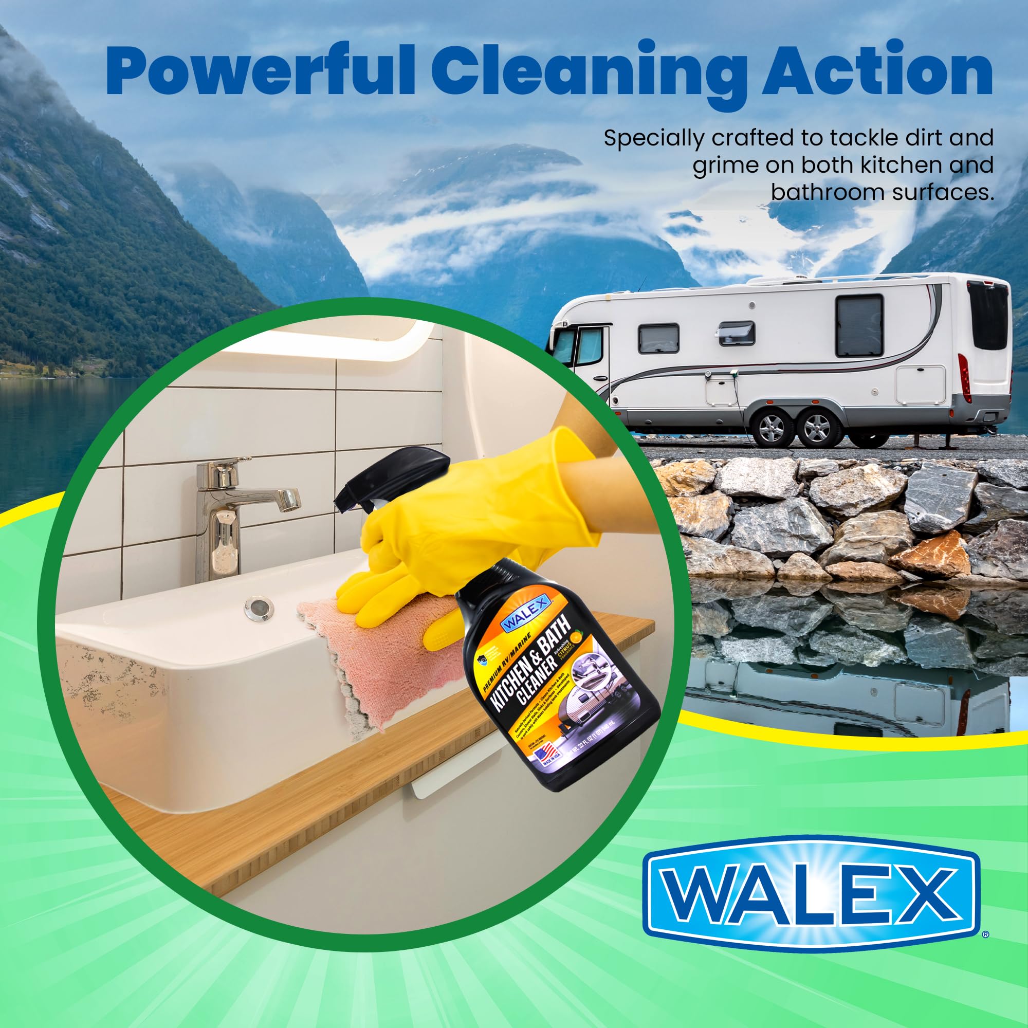The Walex Products WALKB32 Kitchen & Bath Cleaner is a naturally-derived cleaning solution specifically formulated for RV and marine applications. This 32-ounce spray bottle delivers powerful cleaning action on kitchen countertops, sinks, bathroom fixtures, and other hard surfaces commonly found in recreational vehicles and boats.