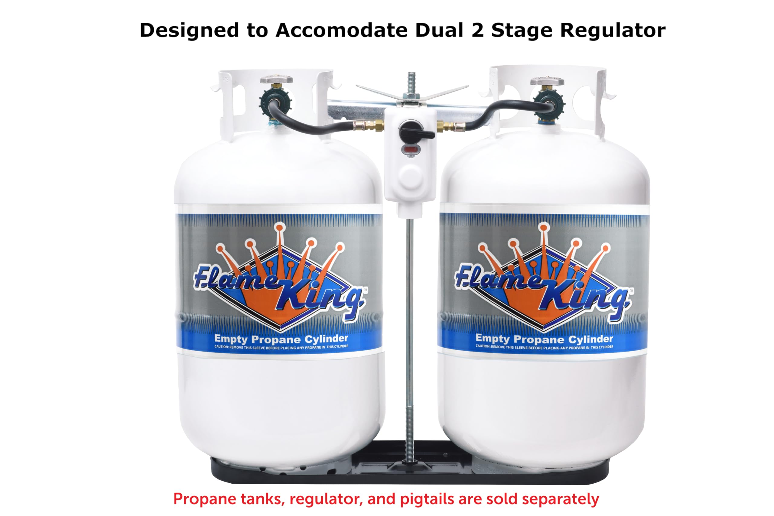 The Flame King KT30MNT is a heavy-duty dual propane cylinder rack designed to securely mount two 30-pound propane tanks on RVs, trailers, and towable campers. This robust mounting system provides a safe and convenient solution for extended travel with additional propane capacity.
