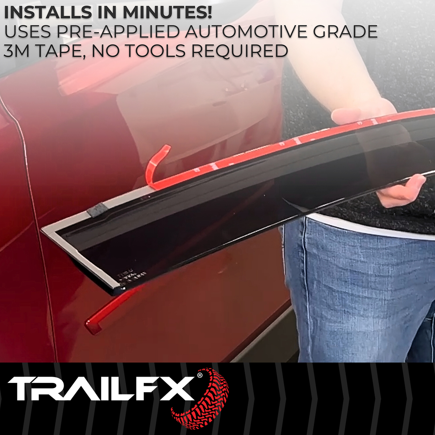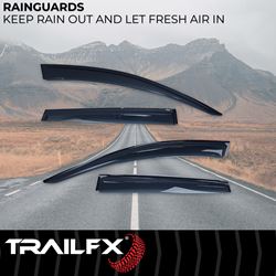 TrailFX Window Vent Visors install easily using pre-applied 3M tape, providing a secure, weatherproof bond. The low-profile design maintains your vehicle's aerodynamics while the durable acrylic material resists cracking and fading. Perfect for drivers who want to enjoy fresh air without rain entering the cabin or to help ventilate parked vehicles.