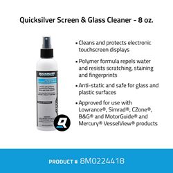 • Quicksilver Screen & Glass Cleaner 8M0224418 cleans and protects all types of glass and plastic automotive and marine electronic touchscreen displays.