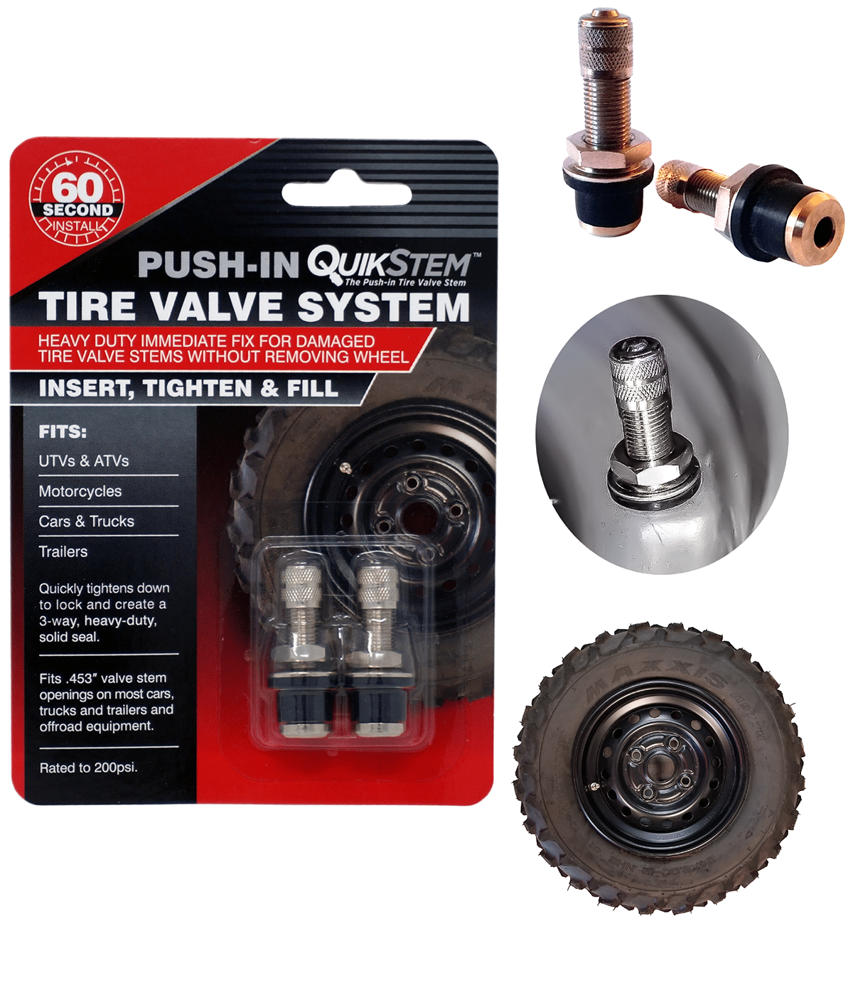 Compatible with any tubeless rim including side-by-sides, UTVs, ATVs, street and dirt motorcycles, trailers, trucks, automobiles, and lawn mowers. Compact and lightweight, QuikStem is a must-have addition to any glovebox, saddlebag, or emergency toolkit, providing a permanent fix in the field for off-roaders and professionals who cannot afford to wait for a tow.