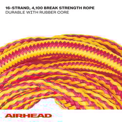 The Airhead AHTRB-50 Bungee Tube Tow Rope brings an exciting new dimension to your towable tubing experience. This innovative 50-foot tow rope features a 3/8-inch diameter bungee cord spliced inside a durable 9/16-inch 16-strand polypropylene rope, creating thrilling surges of speed as the rope stretches and contracts during your ride.