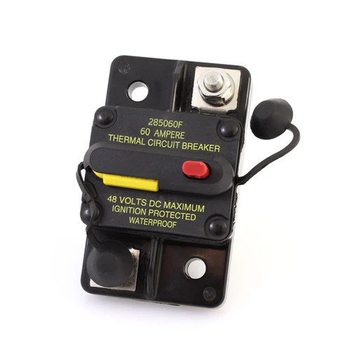 The Bussmann 285060F-121-1 is a 60 amp Type III manual reset circuit breaker designed for medium-duty circuit protection in automotive, marine, RV, truck, and bus auxiliary and accessory circuits. This surface-mount hi-amp breaker serves as both a circuit protection device and an on/off switch, making it ideal for battery systems, high-power DC audio equipment, winches, and other high-amperage applications.
