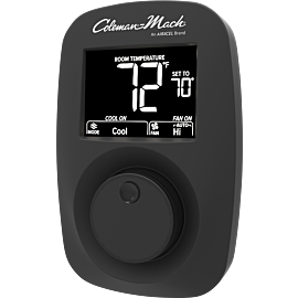 This thermostat is compatible with Coleman-Mach heat pump systems and most single-stage gas furnaces. The unit measures 5-1/2 inches long by 3-3/4 inches wide by 1-1/8 inches high and is intended for use with a 12VDC power supply that does not exceed 2 amps. Minimum 20-gauge thermostat wire is recommended for installation.