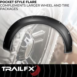 The TrailFX TFF3008S Pocket Style Fender Flares deliver aggressive styling and enhanced tire coverage for 2023-2024 Ford F-250 and F-350 Super Duty trucks. These truck fender flares feature the classic pocket-riveted design that adds a rugged, off-road appearance while providing functional protection from road debris and mud.