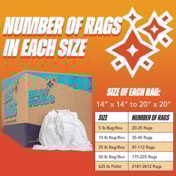 The Cincinnati Color RAG5#BAG is a convenient 5-pound bag of multipurpose shop rags ideal for painting, automotive work, and general maintenance tasks. These absorbent wiping cloths are essential supplies for paint preparation, cleanup, staining projects, and everyday shop use.