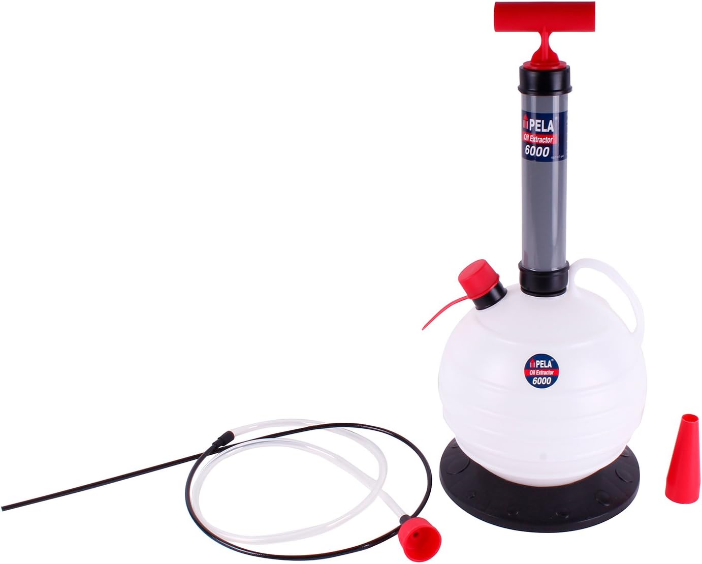 The Pela Products PL-6000 is a 6.0-liter capacity oil extractor designed to remove engine oil, transmission fluid, and other fluids quickly and cleanly without the mess of traditional drain plug methods. This manual vacuum pump extracts fluid through the dipstick tube, making oil changes easier and cleaner for automotive, marine, motorcycle, and small engine applications.