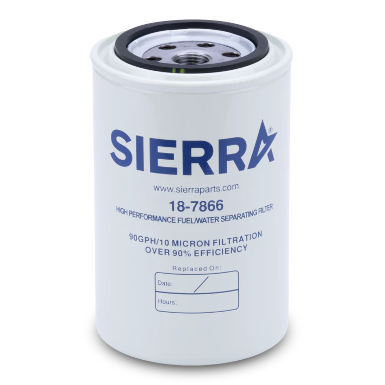 The Sierra 18-7866 is a high-capacity fuel water separator filter designed to remove over 99.8% of emulsified water from gasoline while filtering harmful particulates. This 10-micron filter is engineered for high-performance fuel-injected marine engines, including inboards, sterndrives, and 2-stroke and 4-stroke outboards.