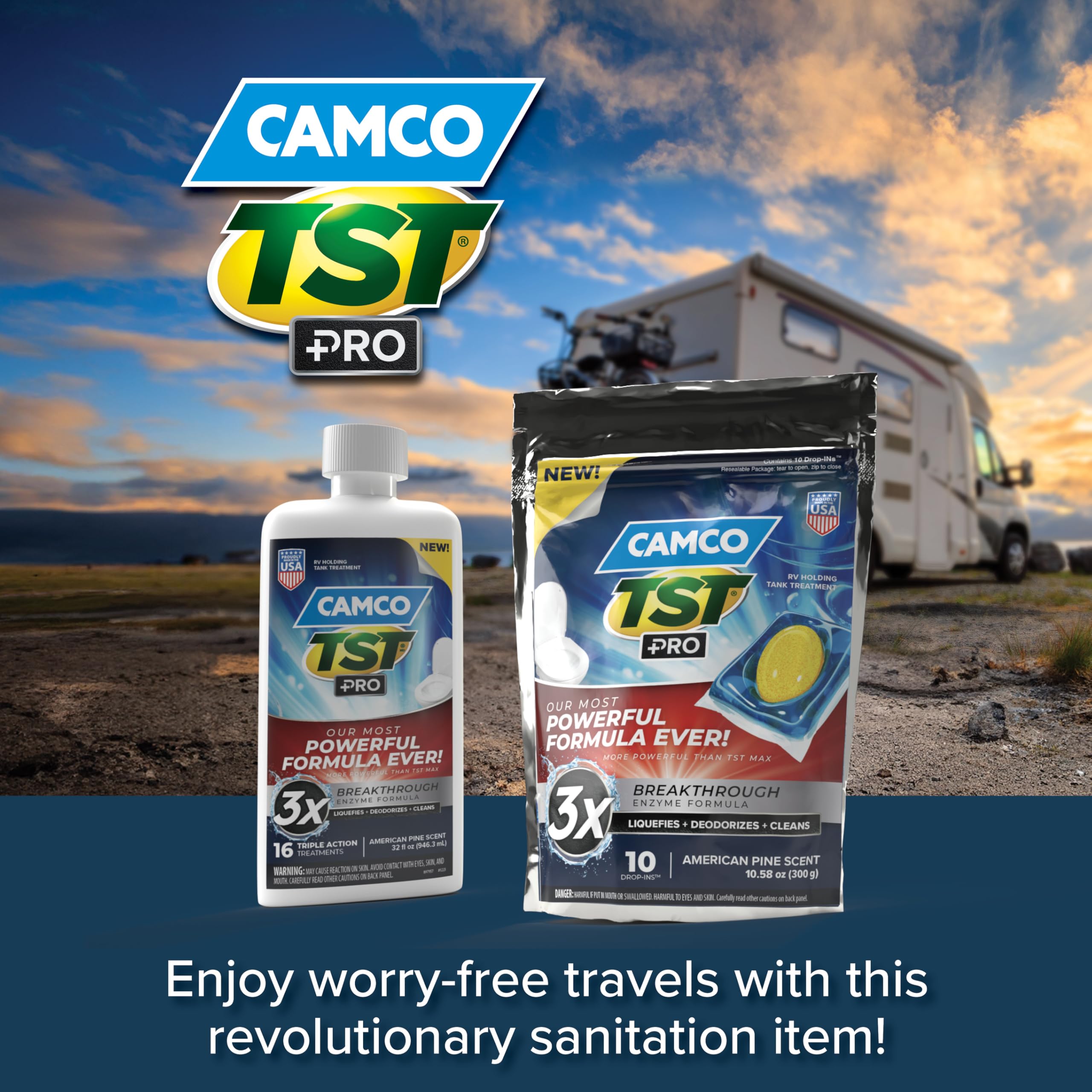 The Camco TST PRO RV Toilet Treatment features an innovative bio-enzymatic formula designed to rapidly break down waste in your RV's black tank system. This advanced treatment uses natural enzymes and bacteria to digest waste and tissue, preventing buildup and ensuring optimal tank performance.
