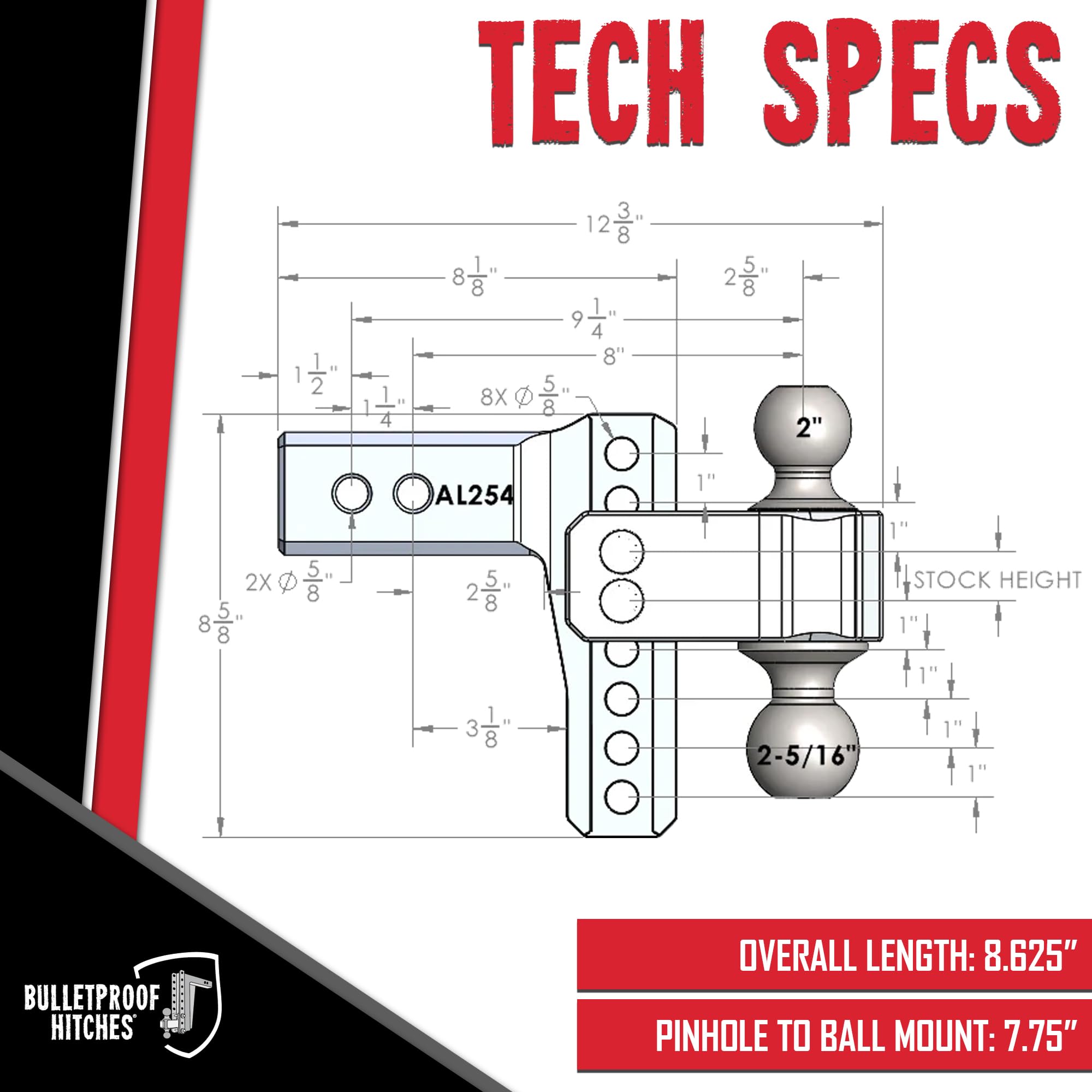 The Bulletproof Hitches AL254 is a heavy-duty aluminum adjustable ball mount designed for 2.5-inch trailer hitch receivers. This versatile hitch provides 4 inches of drop or 4 inches of rise adjustment, allowing you to achieve the perfect towing height for trailers of various sizes.