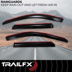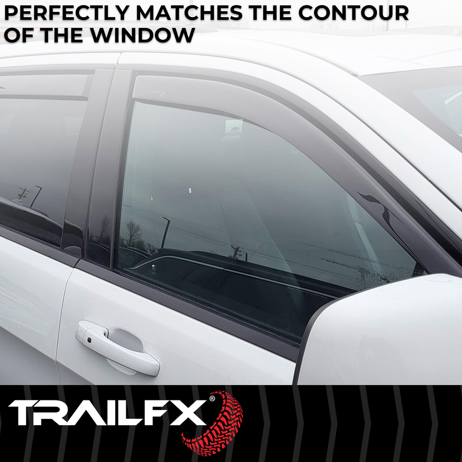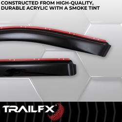 The TrailFX 4252IC in-channel window vent visors offer a sleek, low-profile solution for fresh air circulation while protecting your vehicle's interior from rain and sun. Designed specifically for 2011-2021 Jeep Grand Cherokee and 2022 Grand Cherokee WK models, these smoke-tinted acrylic visors install directly into the window channel for a secure, integrated appearance without exterior tape or adhesives.