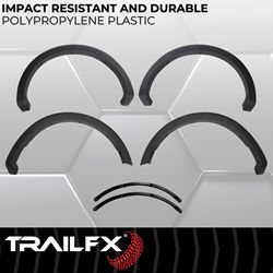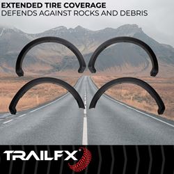 TrailFX fender flares are designed for straightforward bolt-on installation with no cutting or drilling required on most applications. The smooth finish can be painted to match your vehicle's color or left black for a contrasting accent. These flares help maintain a stock appearance while offering the protection and coverage needed for larger wheel and tire combinations.