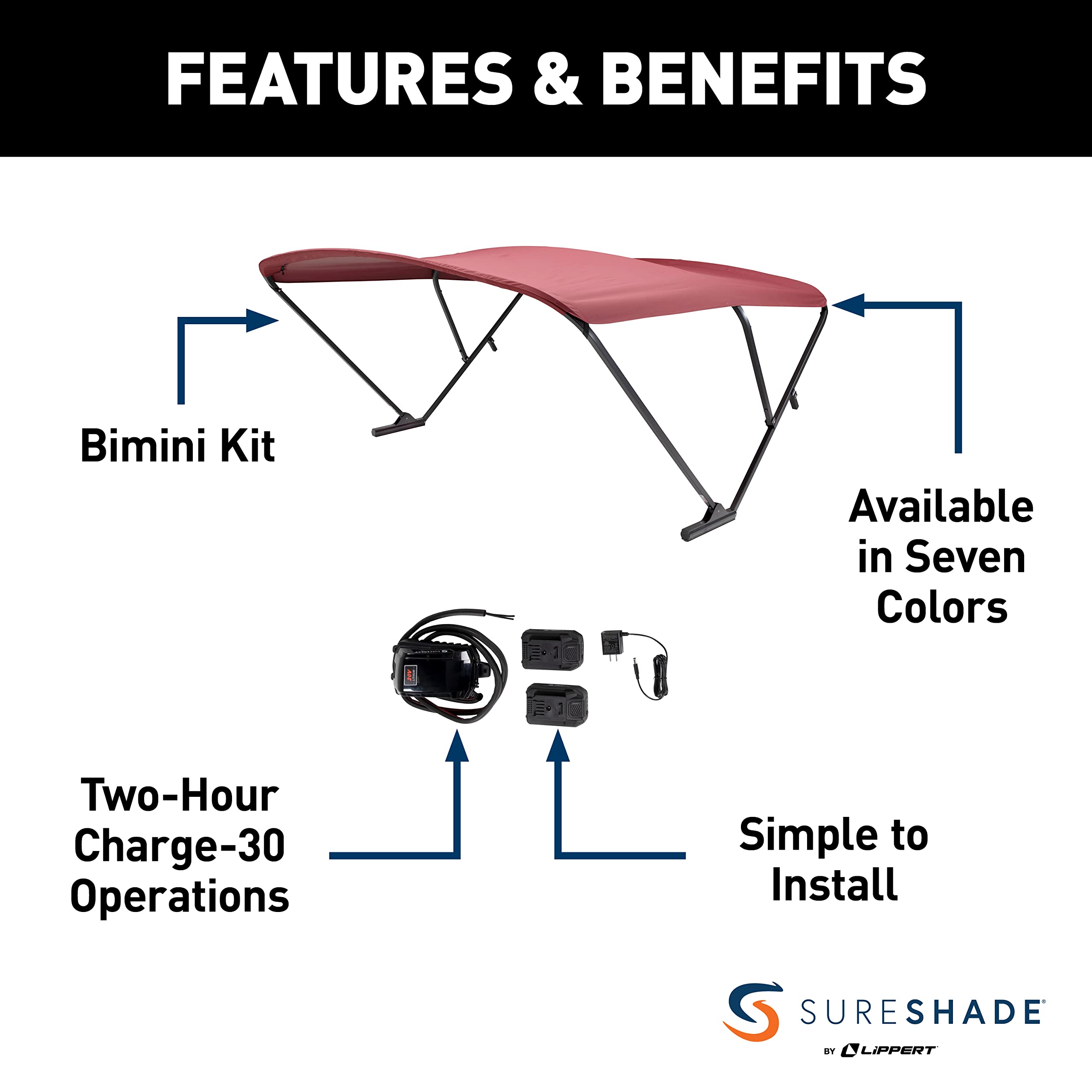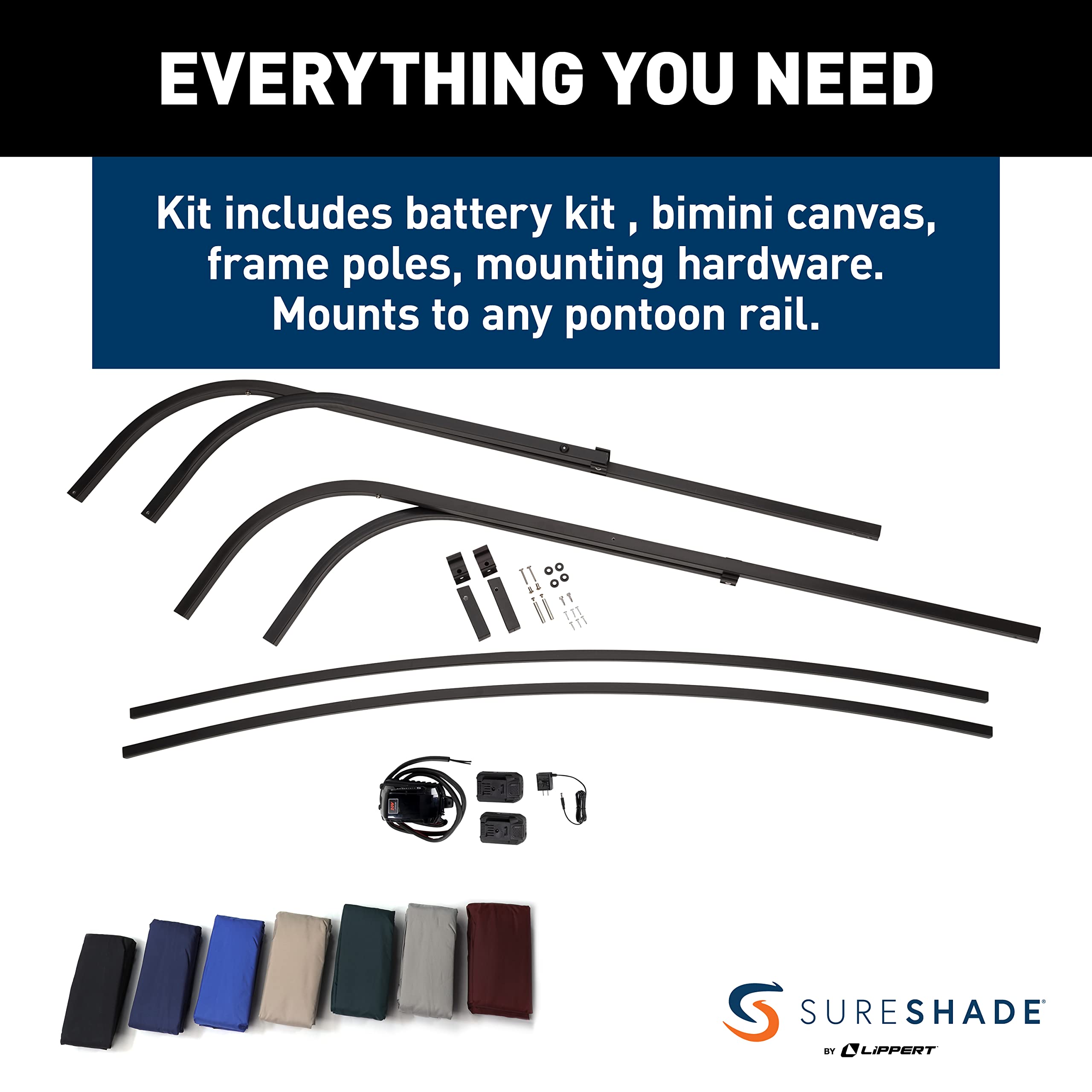 The SureShade Battery-Powered Bimini delivers convenient, push-button shade control for pontoon boats without the complexity of hardwiring. This electric shade system installs easily on pontoons with manual biminis or no existing top, providing instant sun and weather protection with rechargeable 20V battery power.