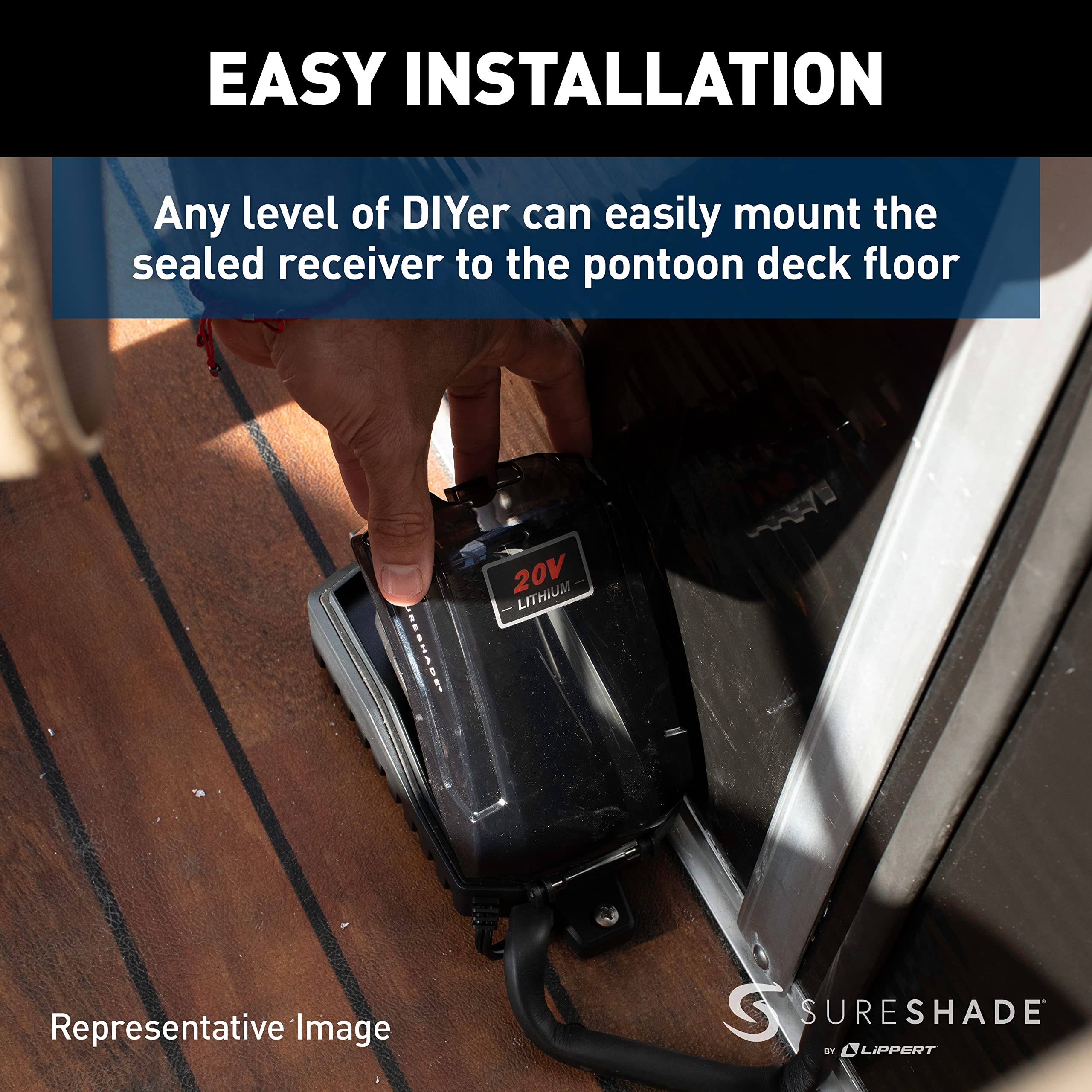 The receiver mounts conveniently beneath the helm station on the boat deck floor, with wire concealment designed to fit any pontoon rail profile. The marine-grade canvas withstands harsh UV rays, saltwater, and weather elements while maintaining its color and integrity. Ideal for boat owners and builders looking for professional shade control without permanent electrical installation.