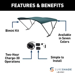 The SureShade Battery-Powered Bimini brings convenient electric shade control to pontoon boats without the complexity of hard-wired systems. This innovative shade system installs easily on pontoons with manual biminis or no existing top, mounting directly to most pontoon rail profiles without running wires through the frame.