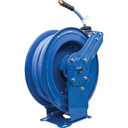 The BluBird BBRDA3850 is a professional-grade dual arm air hose reel assembly featuring a heavy-duty 3/8" x 50' rubber air hose. Built with corrosion-resistant powder-coated steel construction, this hose reel is engineered for demanding commercial and industrial applications.