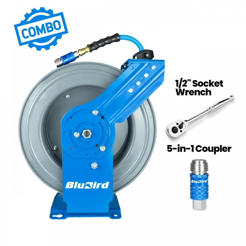 The BluBird BBRDA1250-AIO Dual-Arm Air Hose Reel delivers professional-grade hose management for automotive shops, service bays, manufacturing facilities, and fabrication environments. This all-in-one solution combines a heavy-duty steel reel with a premium 50-foot air hose, ready to install and use right out of the box.