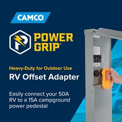 The Camco 55137 Power Grip Offset Adapter allows you to connect your 50 amp RV to a standard 15 amp household electrical outlet. This essential adapter features an ergonomic PowerGrip handle design that makes connecting and disconnecting easier, even in tight spaces or adverse weather conditions.