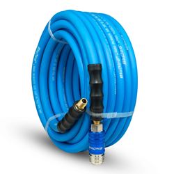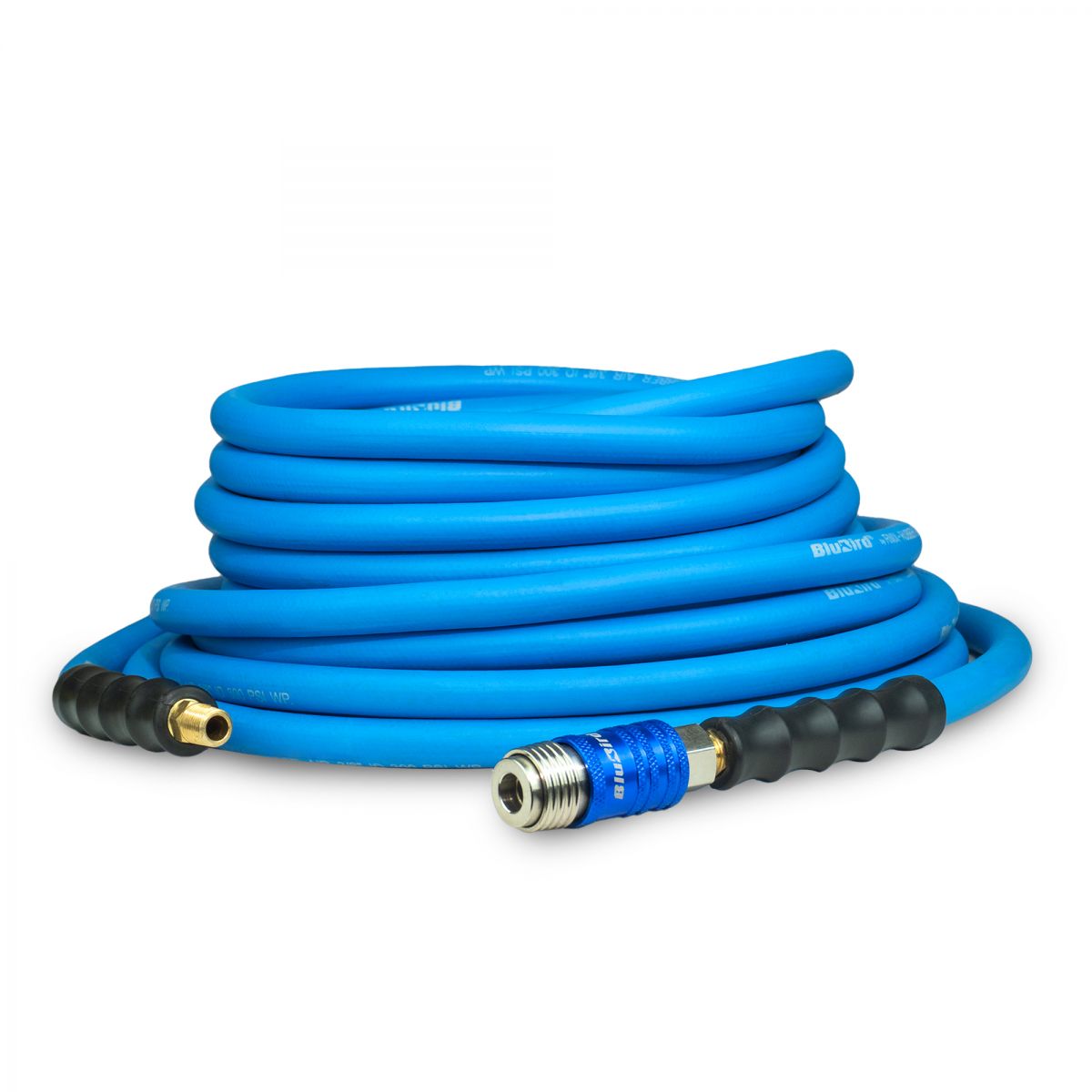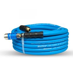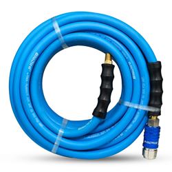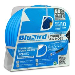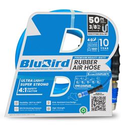 The BluBird BB3850-5CP is a professional-grade rubber air hose engineered for heavy-duty performance in construction, automotive, and industrial applications. This 50-foot hose delivers reliable airflow at pressures up to 300 PSI, with the flexibility and durability needed for demanding work environments.