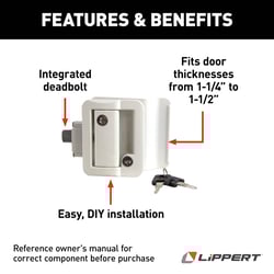 The Lippert Components 2020102689 Global Entry Door Latch is a complete replacement locking system designed specifically for RV travel trailer entry doors. This paddle-style handle assembly provides secure entry control with a sleek black finish that complements modern RV exteriors.