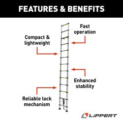 The Lippert Components On-The-Go Telescoping Ladder provides a safe, portable solution for accessing your RV's roof. This aftermarket ladder upgrade is specifically engineered for RVs equipped with the Lippert ladder receiver system, delivering enhanced stability and user-friendly operation.