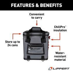The Lippert Components Adventure Pro Soft Cooler delivers reliable insulation and portability for your outdoor adventures. This 18-quart capacity cooler bag holds up to 24 cans or 15 pounds of ice, making it ideal for day trips, tailgating, camping, or beach outings.