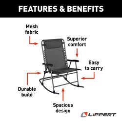 Relax and unwind after a day of outdoor adventure with the Lippert Stargazer Outdoor Rocking Chair. This oversized folding rocking chair combines spacious comfort with portability, making it the perfect companion for RV camping, tailgating, beach trips, and backyard relaxation.