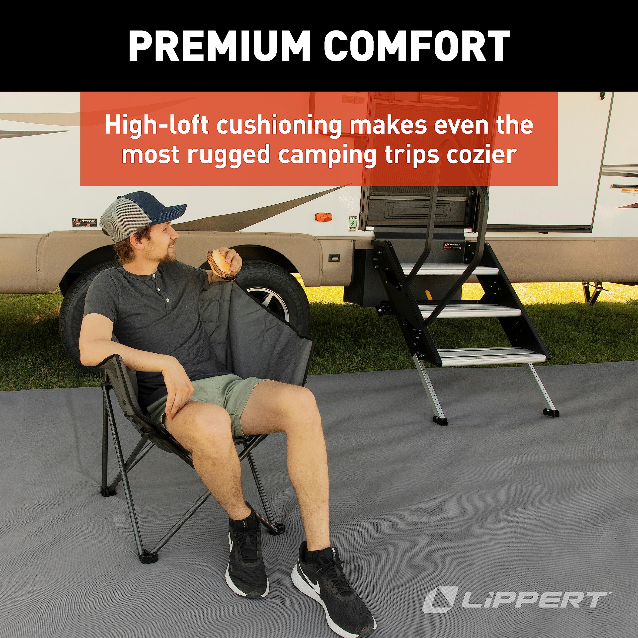 The Lippert Components Campfire Barrel Chair combines comfort and portability for your outdoor adventures. This foldable chair features a distinctive barrel-shaped design with high-loft cushioning that provides exceptional support and comfort during extended use at campsites, tailgates, or backyard gatherings.