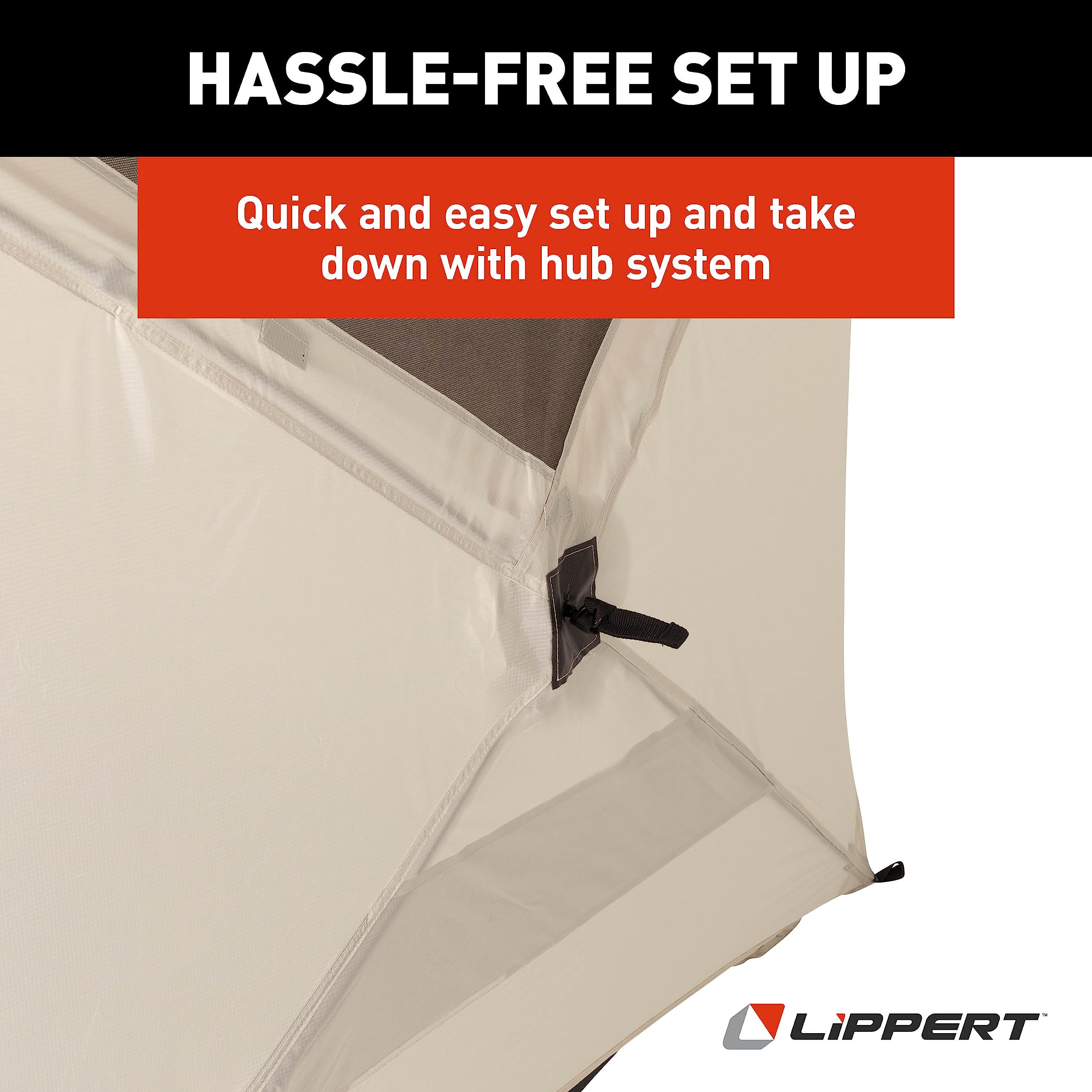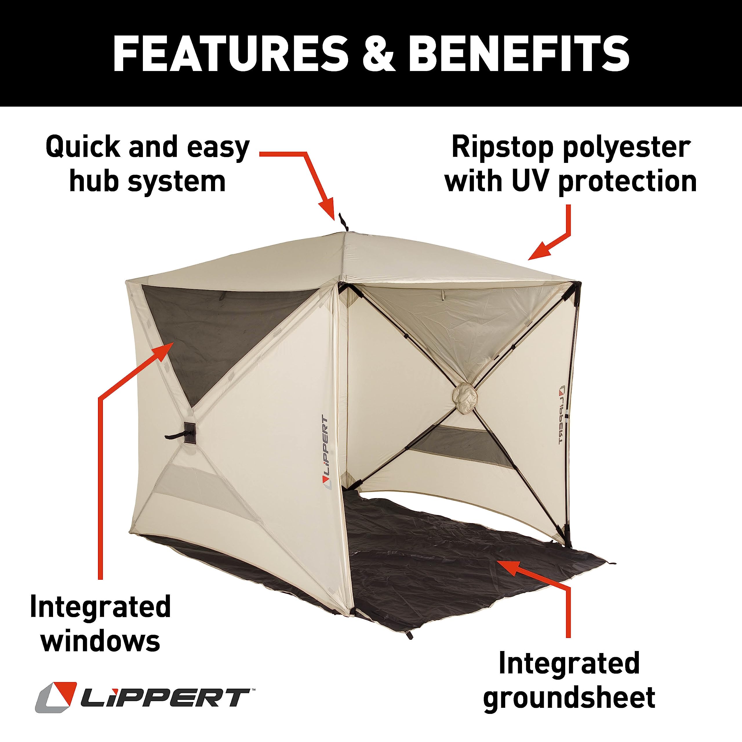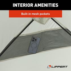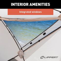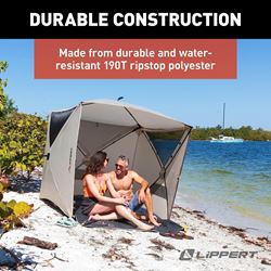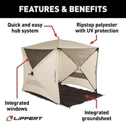The Lippert Components Picnic Pop-Up Sun Shelter provides instant shade and protection for camping trips, beach outings, and outdoor events. This spacious cabin-style shelter features a quick pop-up design that sets up in seconds without complicated assembly.