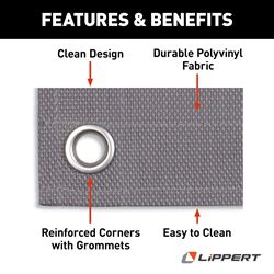 The Lippert Components 2022115660 is a durable 6' x 9' outdoor patio rug designed specifically for RV and camper use. This grey all-weather mat features a tight weave polyvinyl construction that stands up to the elements while providing a comfortable surface outside your recreational vehicle.