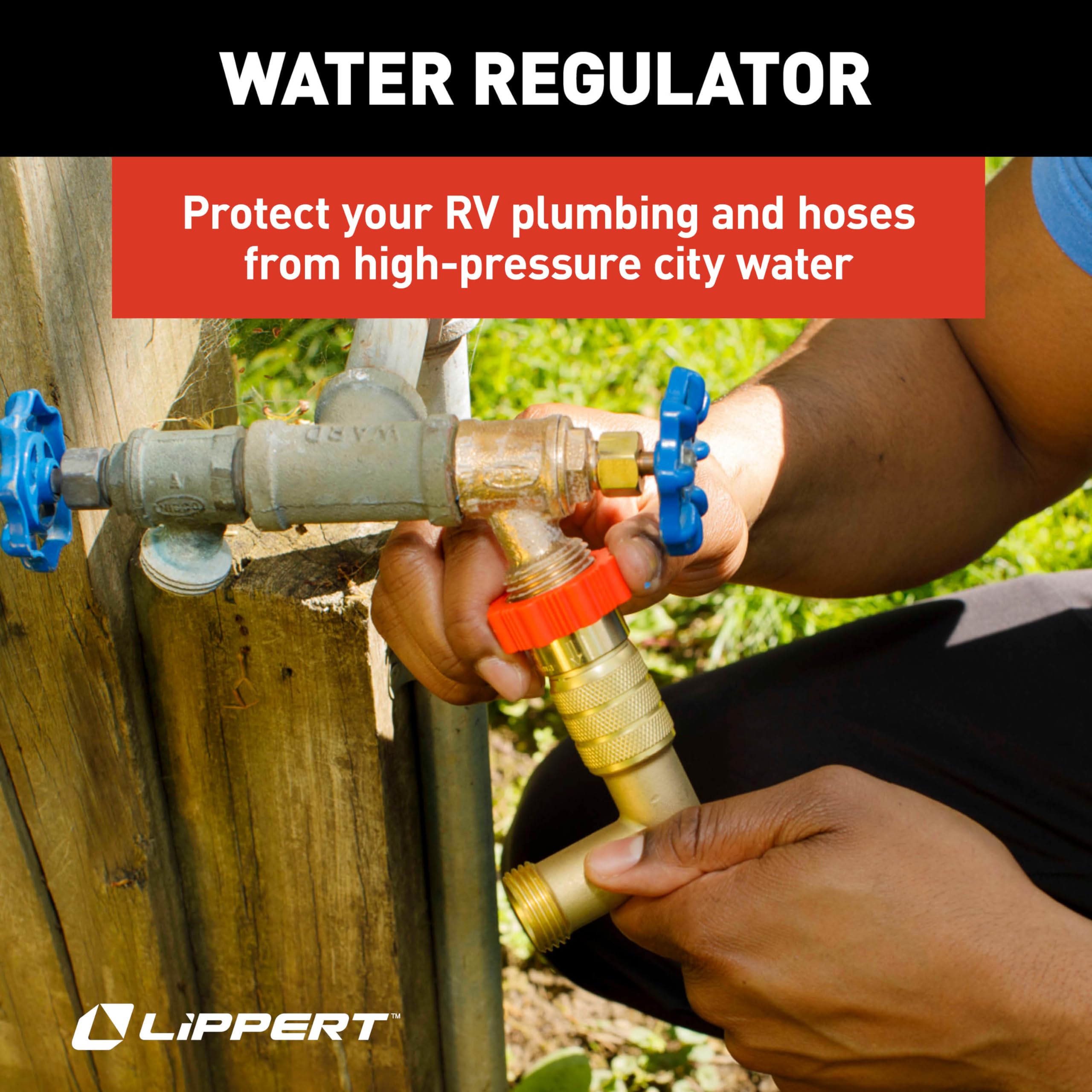 • Water pressure regulator to protect RV plumbing systems