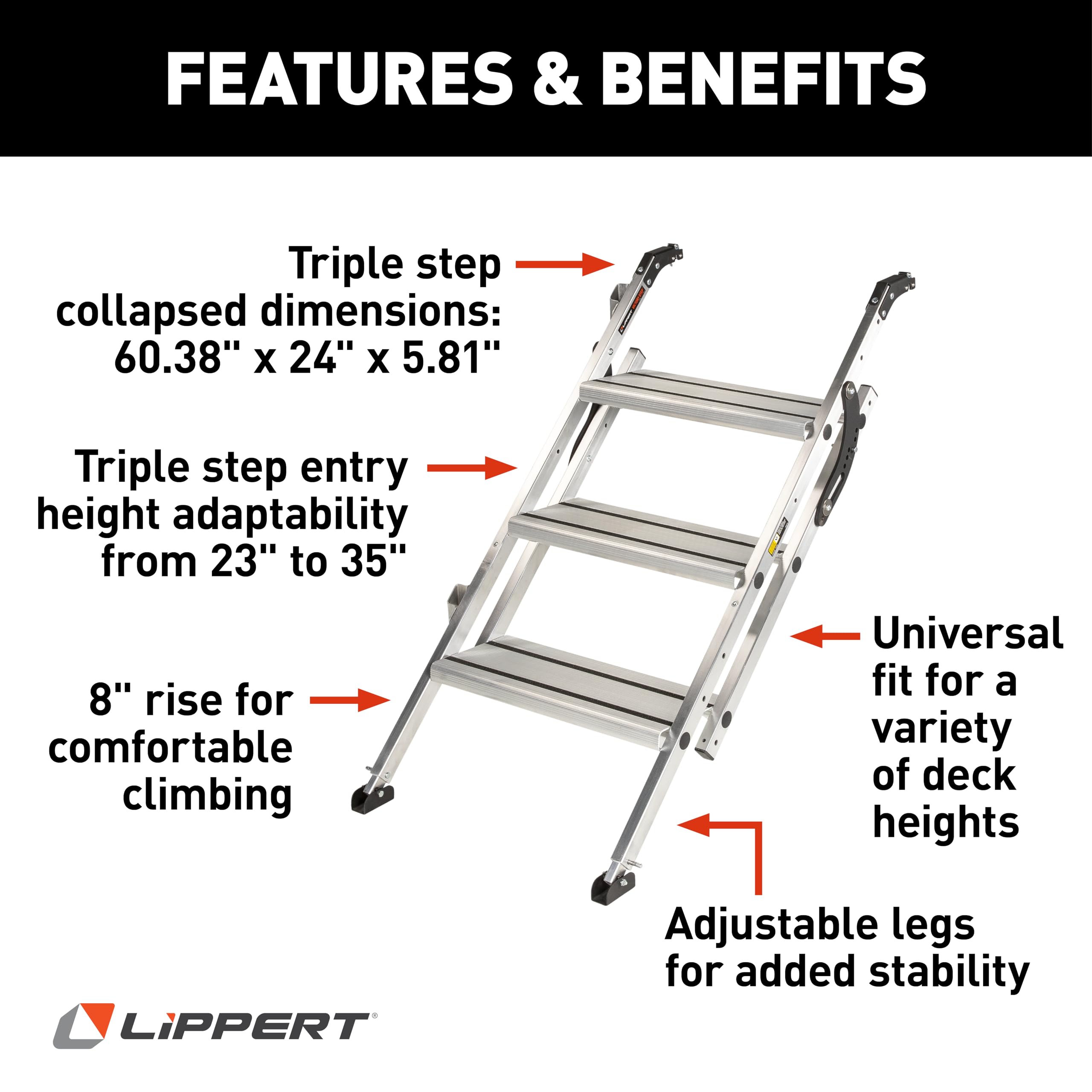 The Lippert Components Victory Step is a collapsible triple step system designed specifically for rear toy hauler patio openings. This versatile entry solution can be mounted to either the side or rear of your patio space, providing safe and convenient access to your RV's outdoor living area.