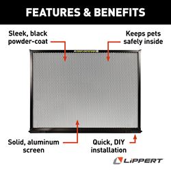 The Lippert Components Screen Defender is a durable aluminum screen protector designed to safeguard your RV entry door screen from pet damage, debris, and wear. This powder-coated black screen panel installs quickly into the existing channels of your Lippert screen door, providing an extra layer of protection without requiring permanent modifications.