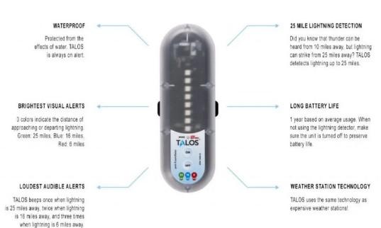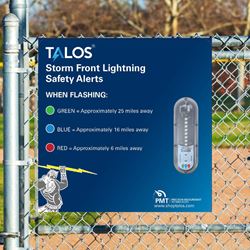 The 14″ x 14″ TALOS Safety Sign Kit informs guests of dangerous lightning in the surrounding area with easy-to-read details. When the attached device starts flashing from one color to the next, guests can be made aware in real time that lightning is close enough to strike their location.